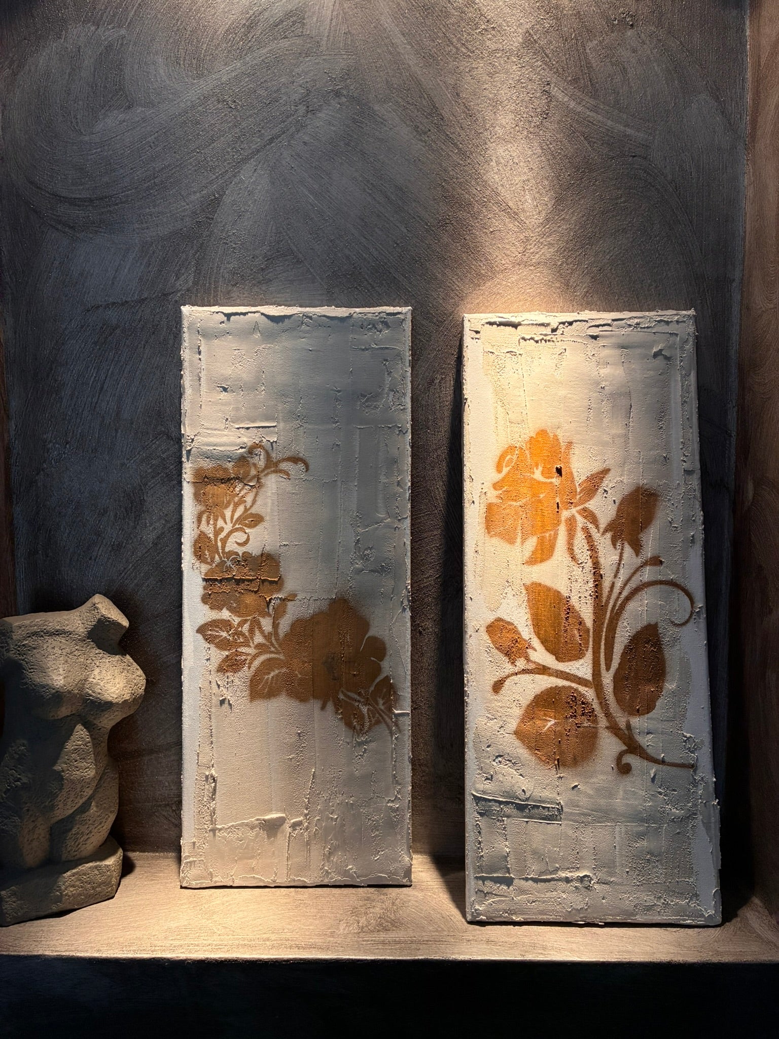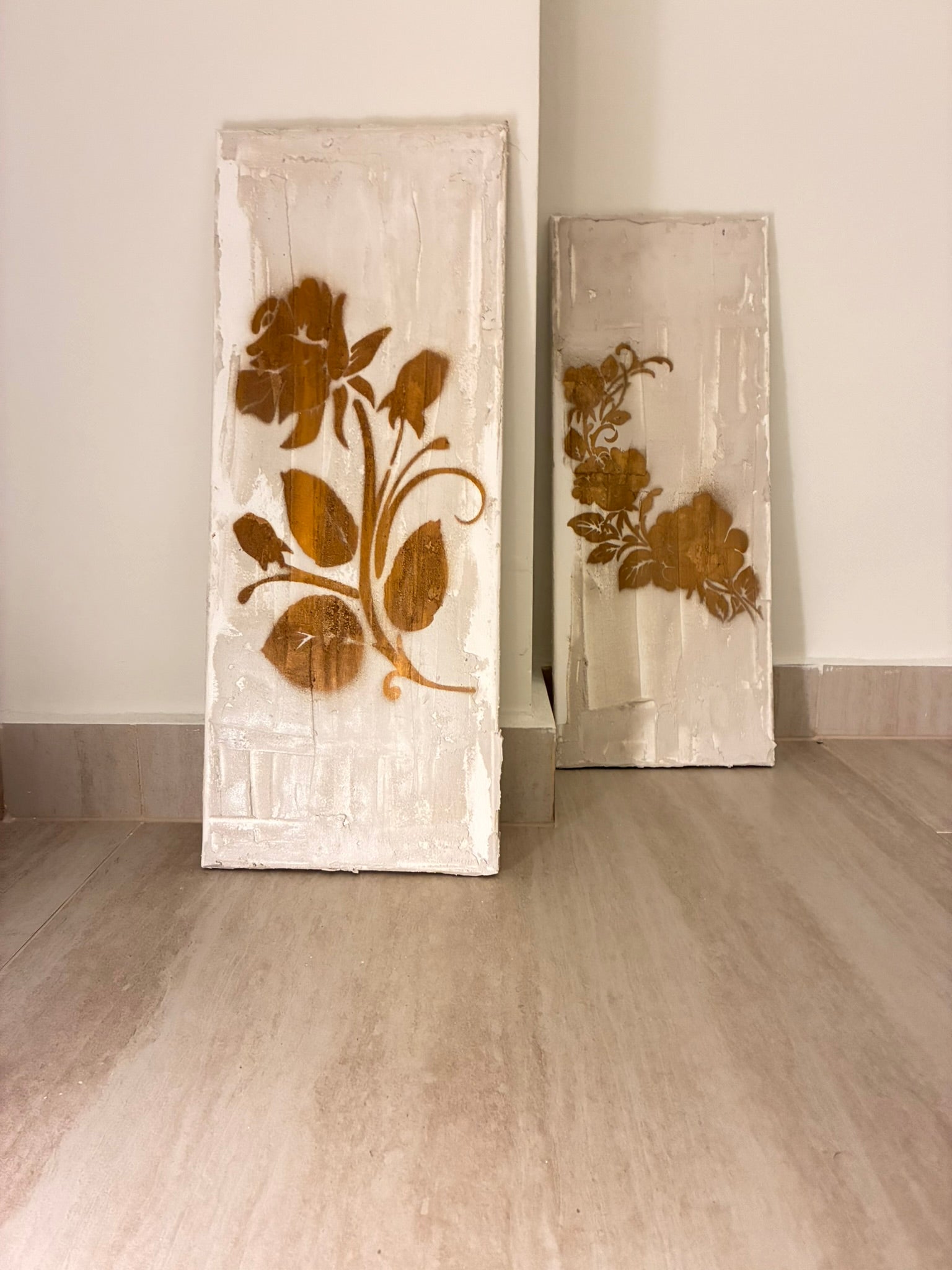 A set of two elongated, hand-textured paintings featuring a golden flower on each panel. Created with a palette-knife technique, the surfaces emphasize depth and movement, giving the floral forms a luminous, sculptural presence when displayed together.