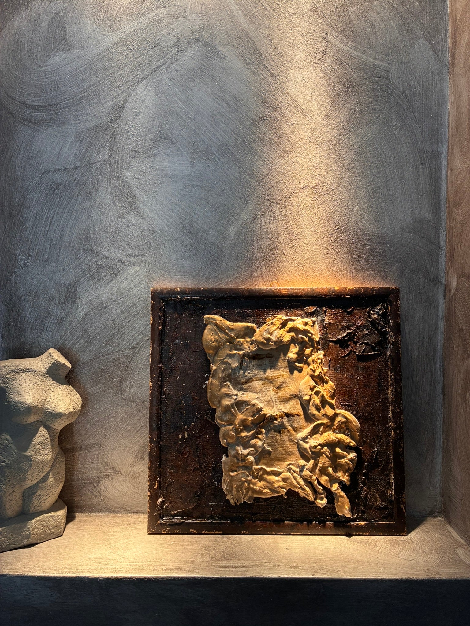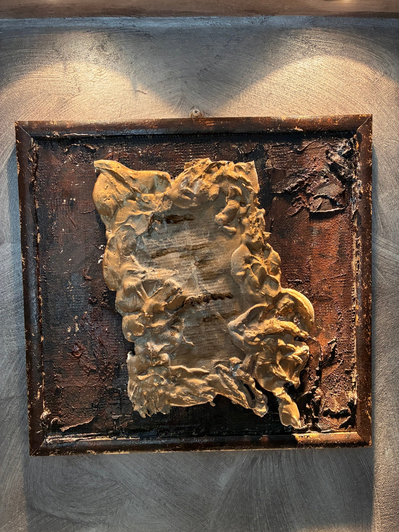 Mixed-media artwork using textured materials like plaster and clay, incorporating a fragment of a newspaper. The layered surface creates a tactile, sculptural effect, blending text and texture in a single expressive composition.