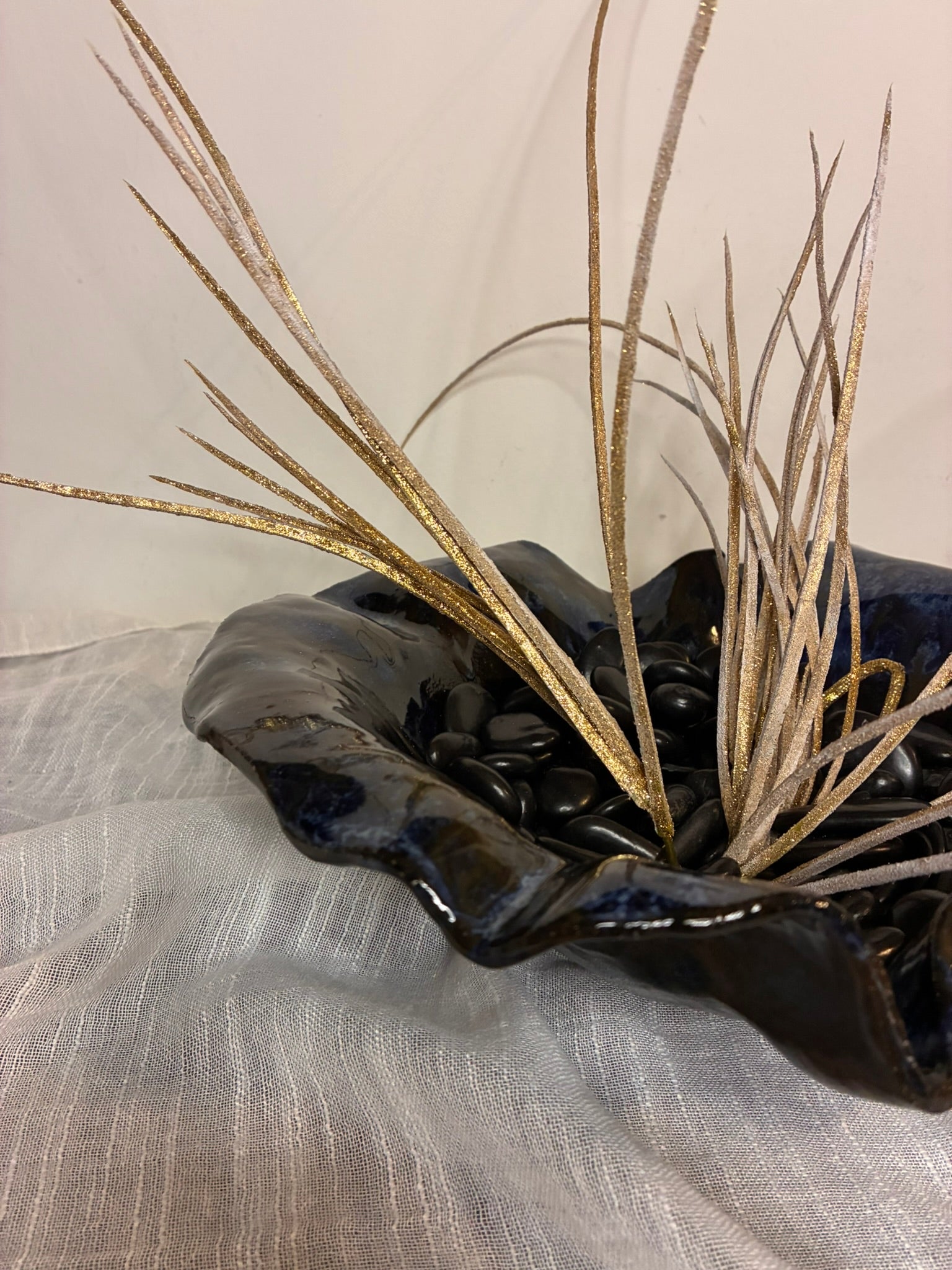 This handcrafted deep ceramic bowl features a wavy, organic form with subtle blue glaze accents, giving each piece a unique and artistic character. Perfectly versatile, it can be used as a decorative centerpiece or functionally for serving salads, fruits, or other dishes. Each bowl is individually made by hand, with natural variations in shape and glaze. Combining practicality with sculptural elegance, it brings both beauty and functionality to any table or display.