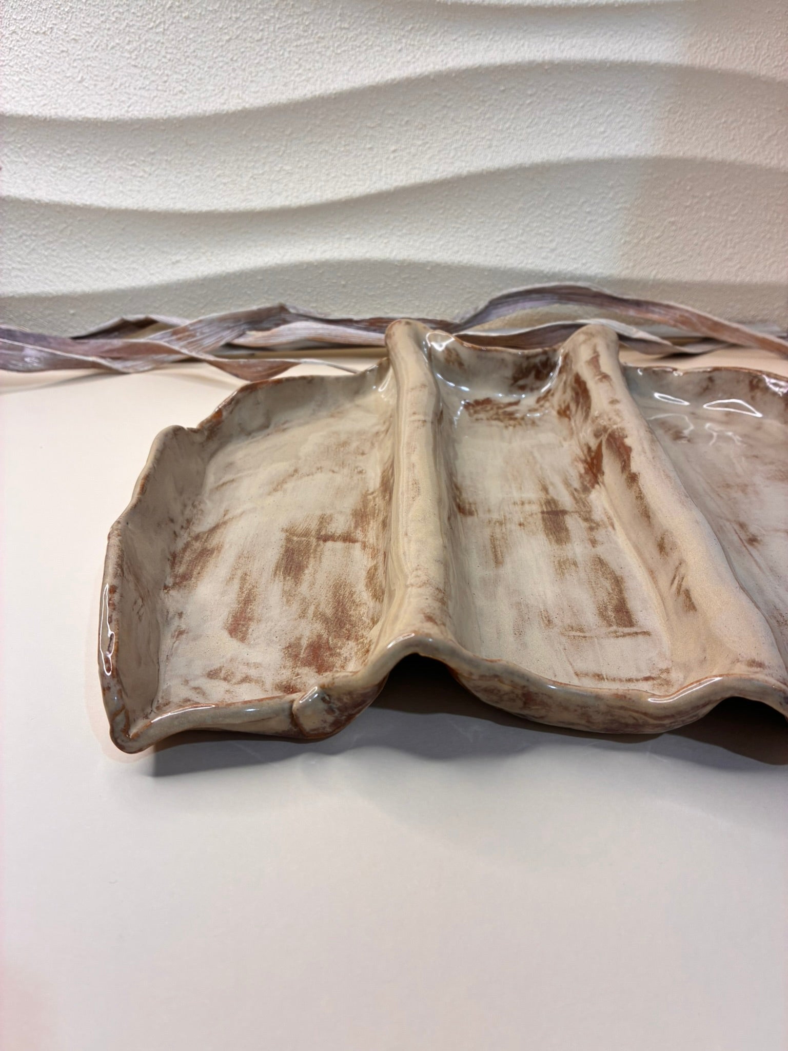 The Dune Wave Serving Platter draws inspiration from wind-swept sand patterns and the soft flow of natural forms. Handcrafted with three gentle ridges that create elegant sections, it’s perfect for presenting appetizers, cheeses, or desserts with effortless style. The warm, earthy glaze enhances its organic texture, making it both functional and visually captivating — a true centerpiece for any table.