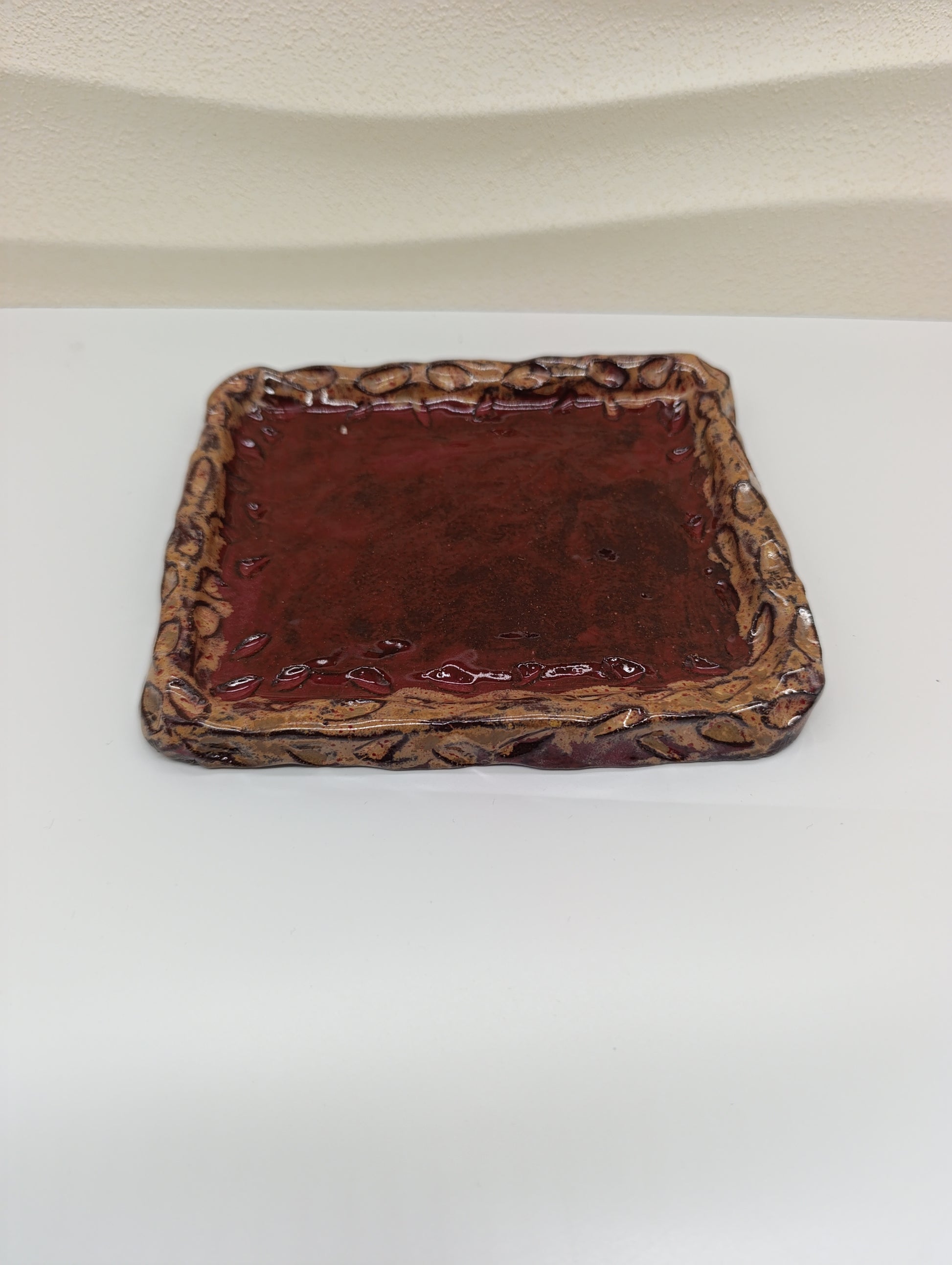 The Ember Frame Ceramic Tray combines rustic charm with timeless craftsmanship. Its rich red glaze, encased by a sculpted, fire-toned rim, gives it both warmth and character. Perfect for serving small bites, holding jewelry, or adding an artistic accent to your space, this handcrafted tray reflects the natural beauty and texture of clay shaped by hand and flame.
