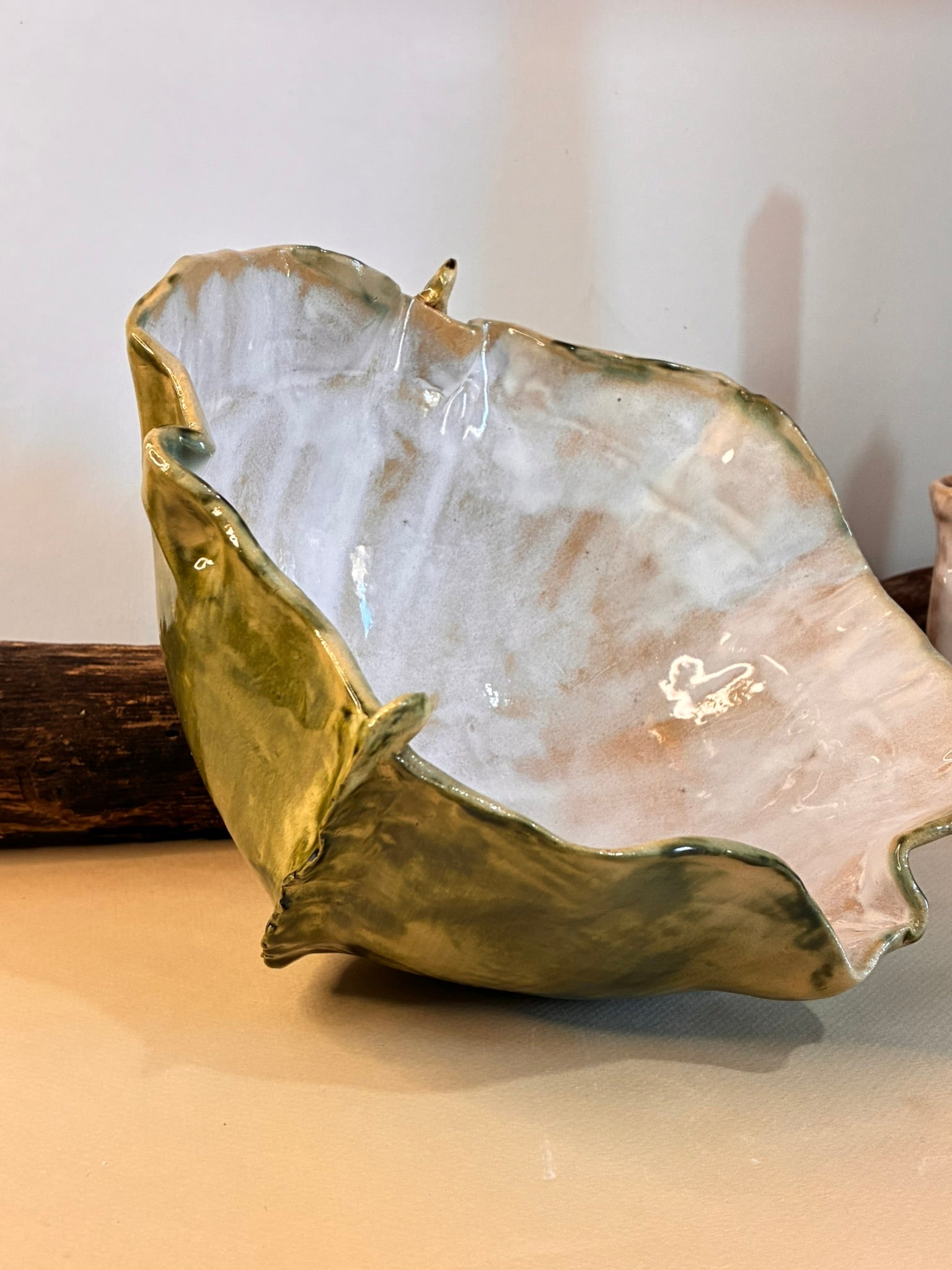 This large, heavy-duty stoneware bowl is a one-of-a-kind statement piece. Hand-formed to mimic the fluid shapes of nature, it is perfect as a fruit bowl, a centerpiece for your dining table, or a standalone art object. The high-gloss glaze is easy to clean and durable, making it as functional as it is beautiful.