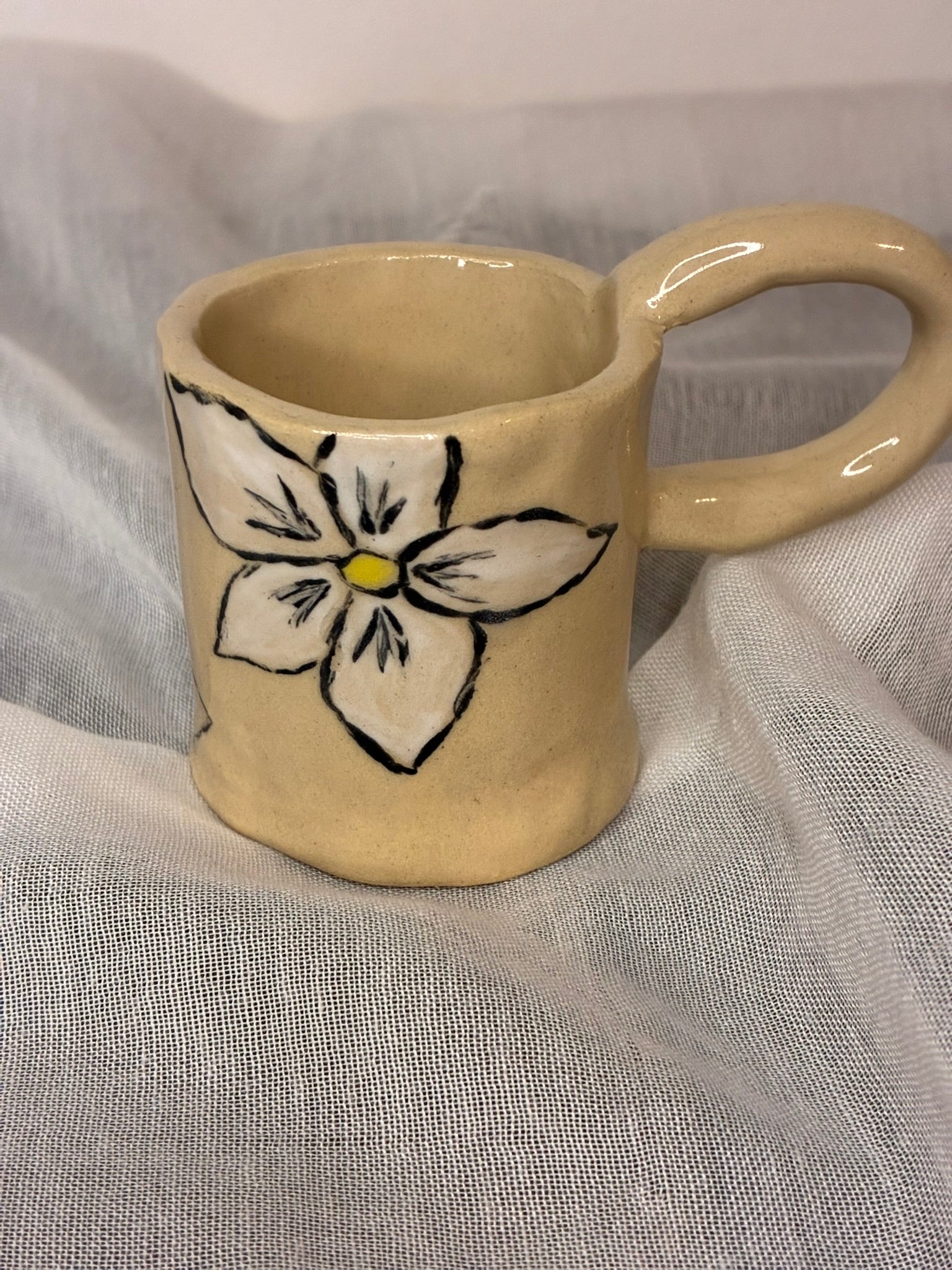Bright, bold, and a little bit mischievous, this cup is basically a flower that learned how to hold your drink. The hand-drawn blossom beams with a sunny yellow center, giving off gentle cartoon energy, like it might say “good morning!” if it could. Its loop-y, oversized handle brings comfy, cozy vibes — perfect for those who like their mugs as friendly as their beverages.