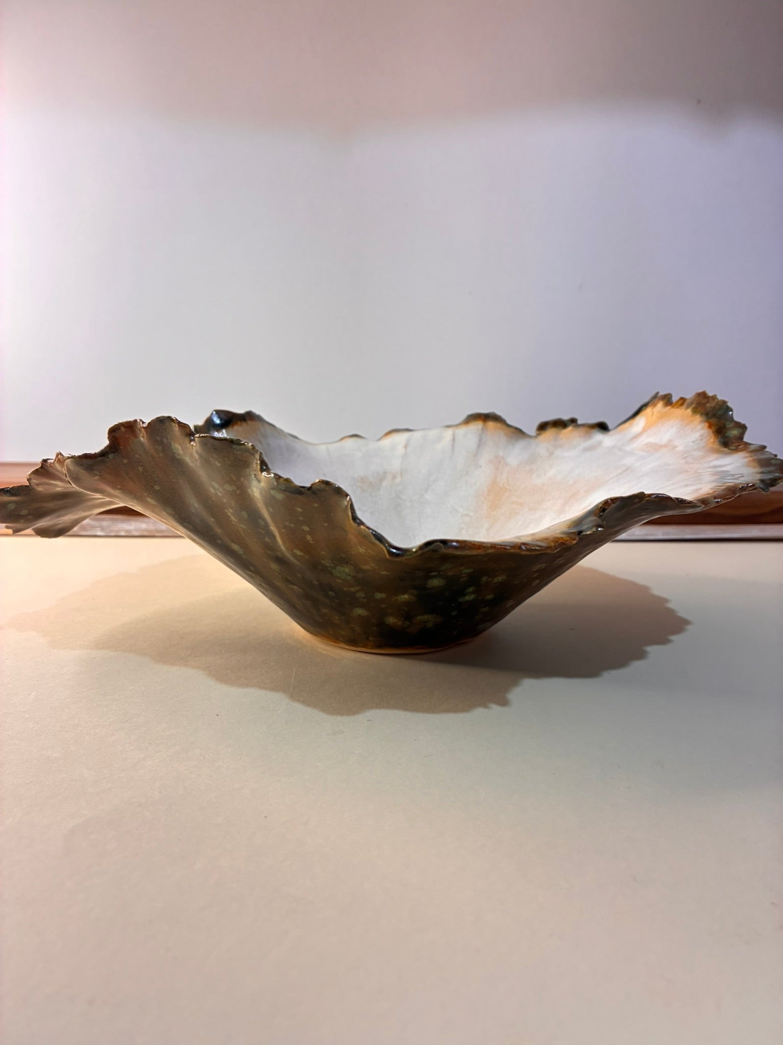 The soft ivory surface blends seamlessly into warm earthy tones along the sculpted rim, creating a striking contrast that highlights its artisanal character. Individually shaped and carefully glazed, this decorative piece adds texture, depth, and modern sophistication to any interior setting.