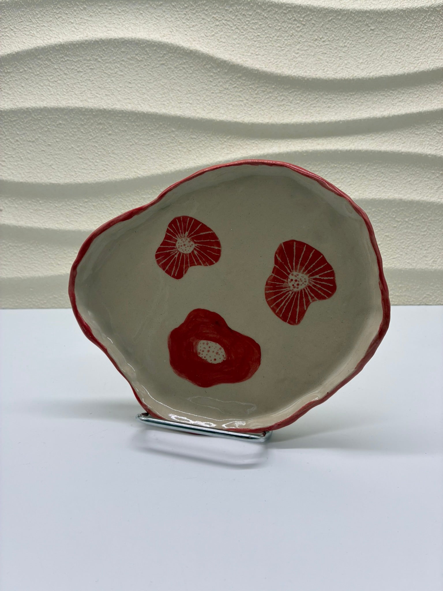 Bring warmth and character to your table with this handcrafted ceramic plate featuring bold red floral motifs. Set against a natural beige background, the expressive hand-painted flowers and softly irregular red rim create a charming, artistic look.