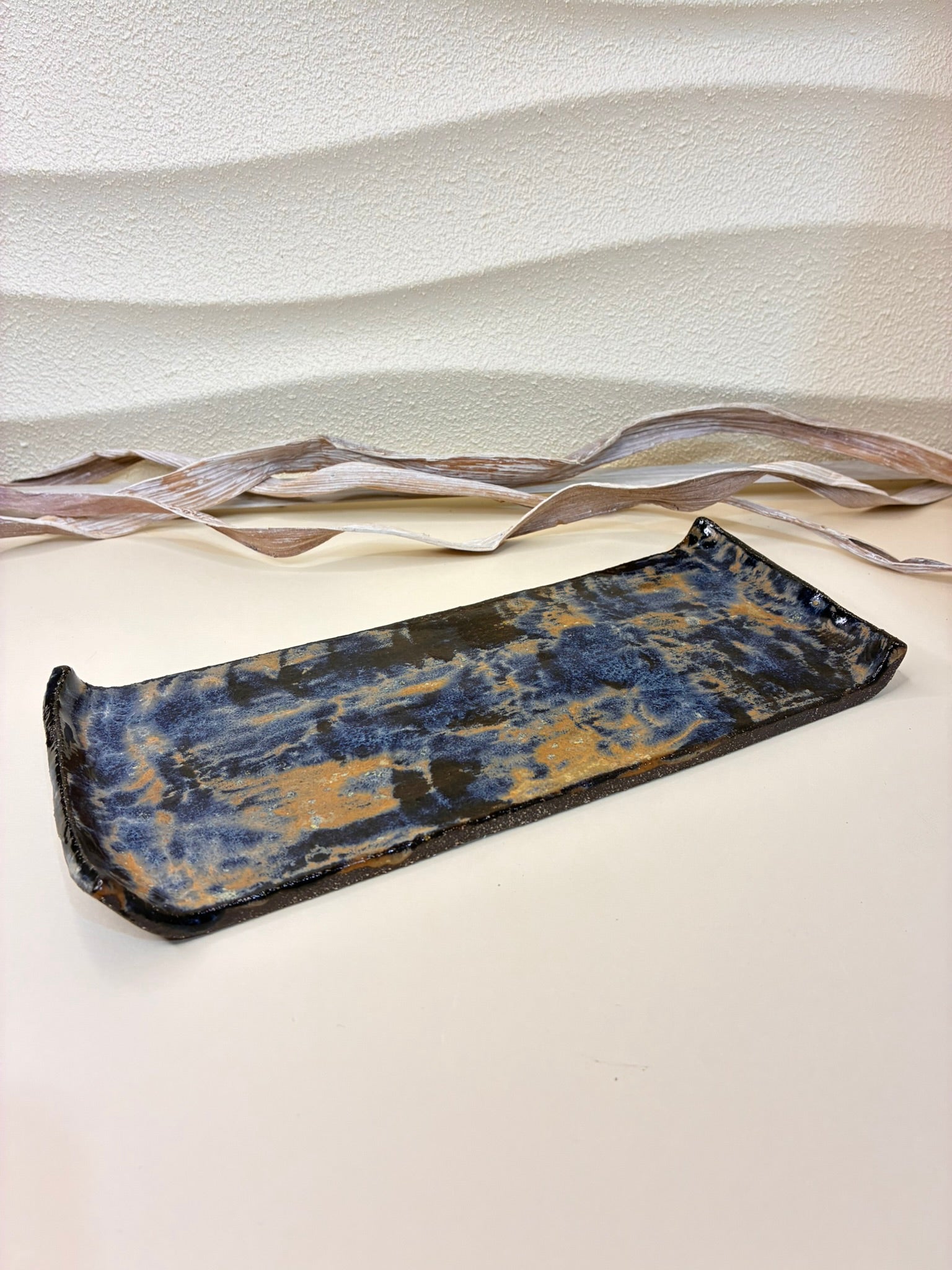 This ceramic plate showcases a dramatic swirl of midnight blues and earthy browns, creating a stormy, painterly effect across its surface. Its handcrafted form with slightly lifted corners adds character and balance. A striking piece for serving sushi or appetizers, it doubles as a decorative art object when not in use.