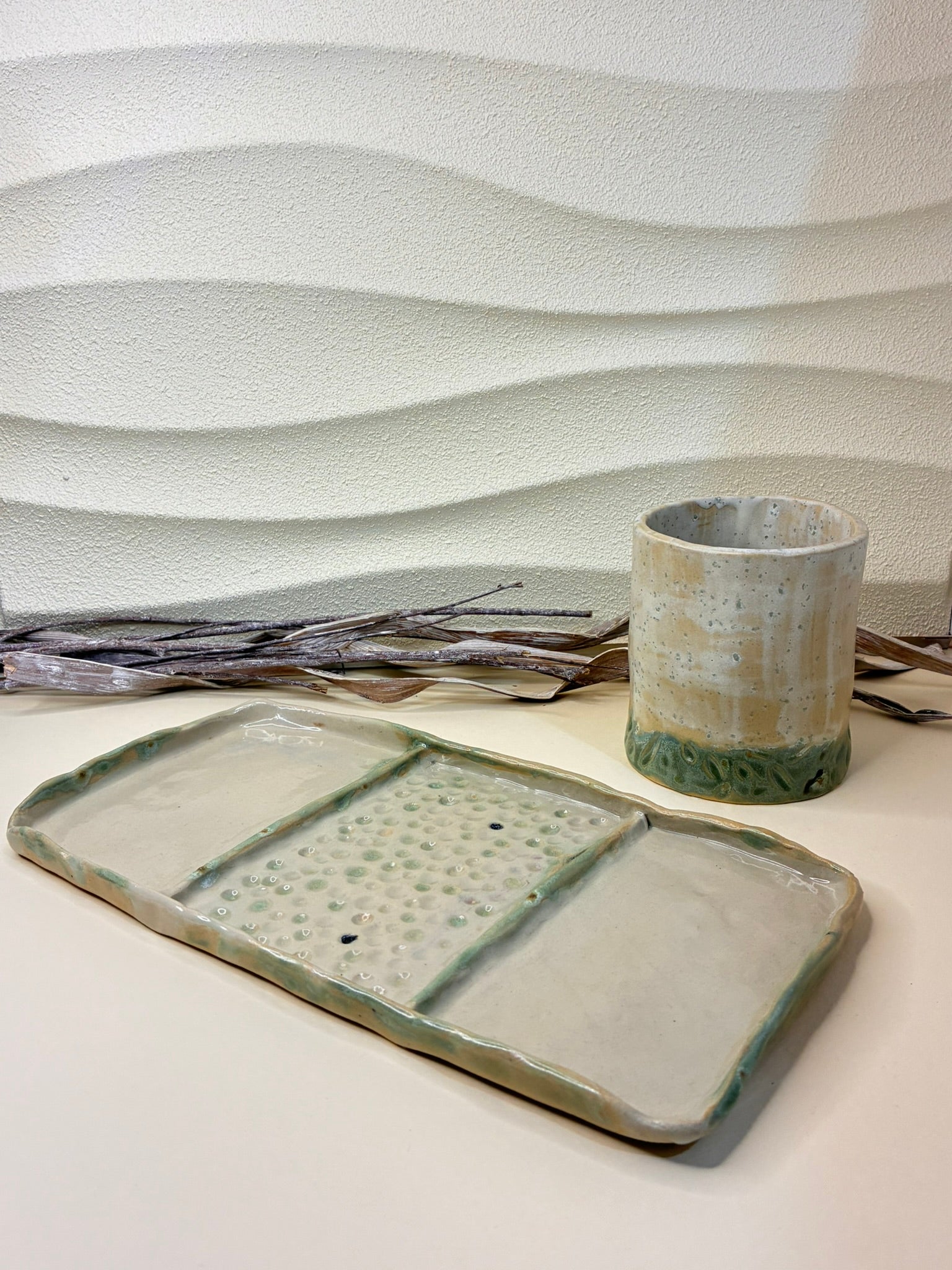 The Verdant Divide Serving Platter combines modern structure with organic artistry. Its rectangular form is sectioned into three functional areas, one accented with delicate, raised glassy droplets and subtle green undertones that evoke mossy earth after rain. Perfect for arranging appetizers, sushi, or tasting selections, this platter blends natural tones and handcrafted texture for a serene, contemporary table setting.